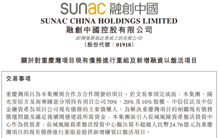 1月23日晚间,融创中国(HK01918,股价1.490港元,市值138.66亿港元)公告称,公司与中国长城资产就重庆湾项目达成融资合作,后者拟出资不超过24.76亿元对重庆湾项目现有债务进行重组并提供新增融资。